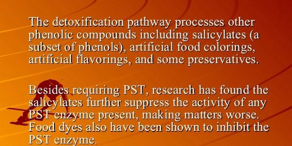 Phenols/salyicilates need to be broken down in the body, i.e. “detoxified,” by a process called sulphation. This pathway called the sulphation pathway requires sulphur in the form of sulphate and the PST (phenol sulfur transferase) enzyme. Without normal levels of sulphates in the body (faulty sulphation) this enzyme cannot do its job of helping the body to break down and excrete phenols effectively. And this leads to PST deficiency.
